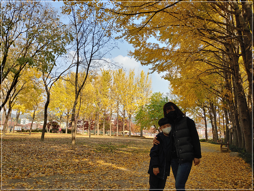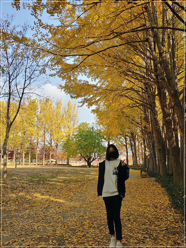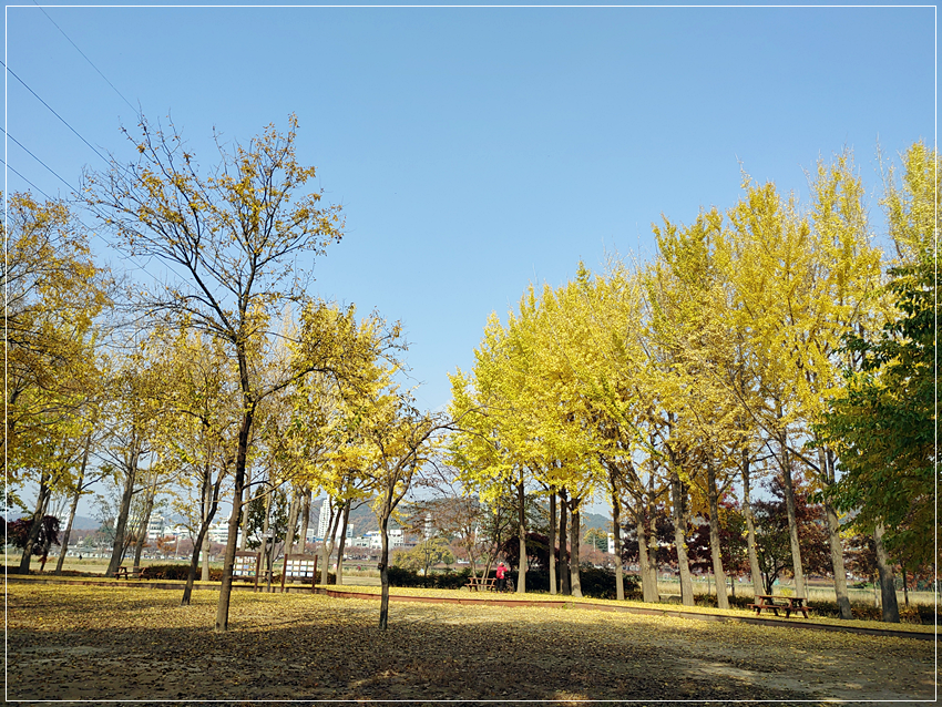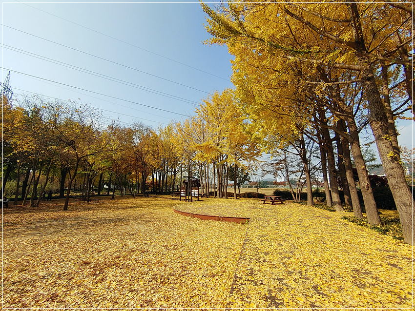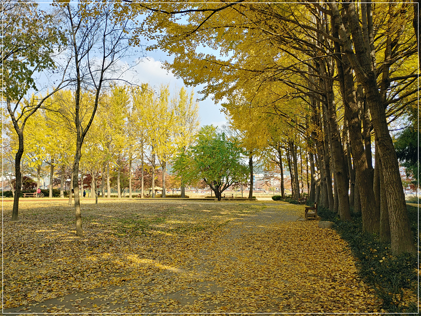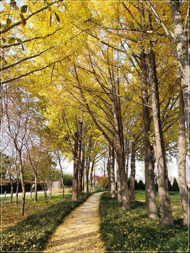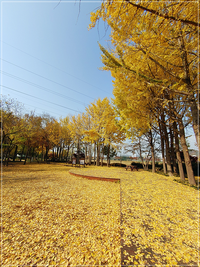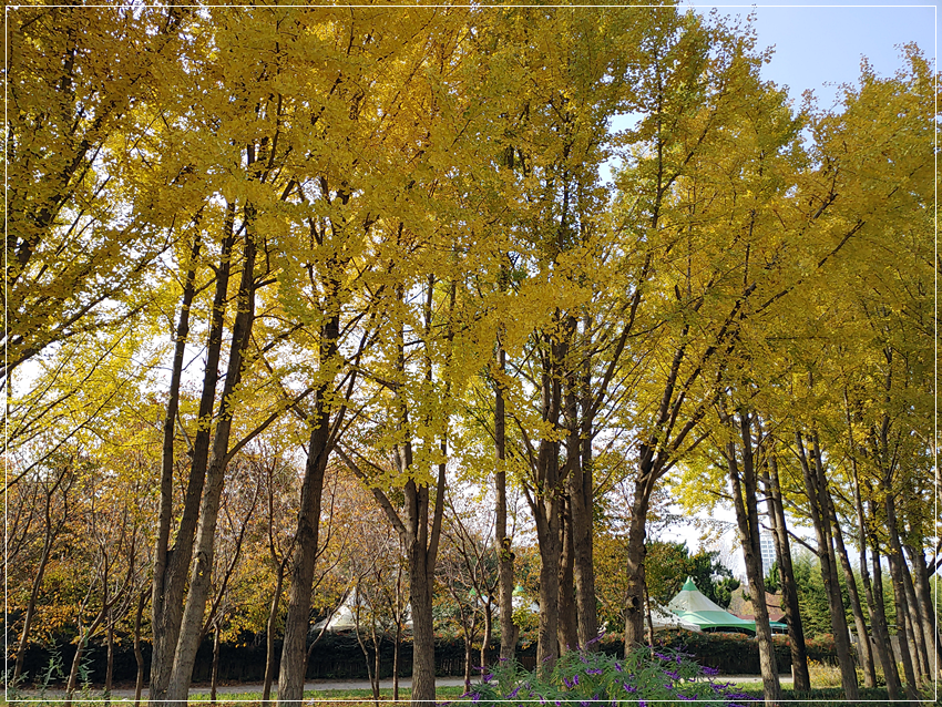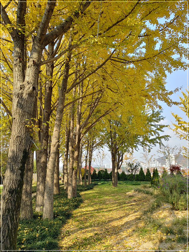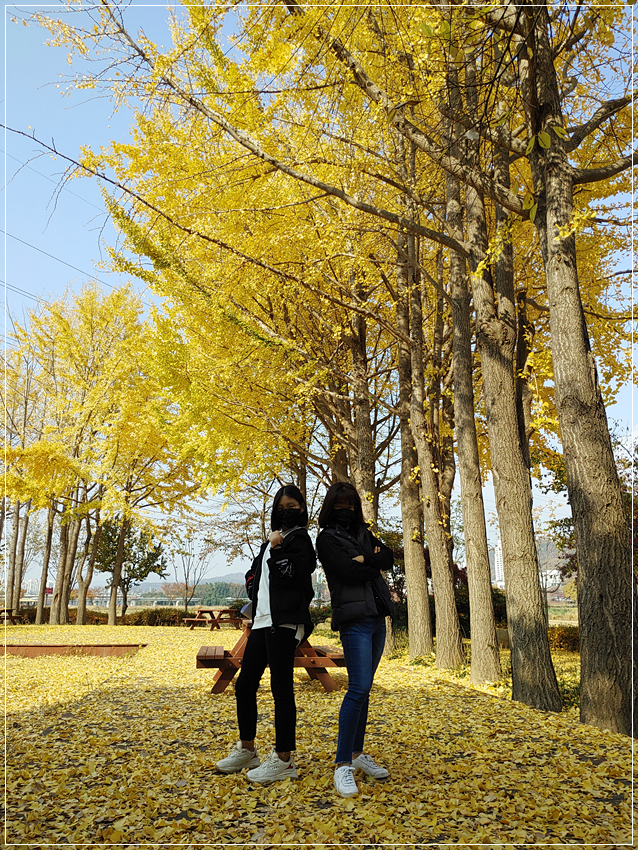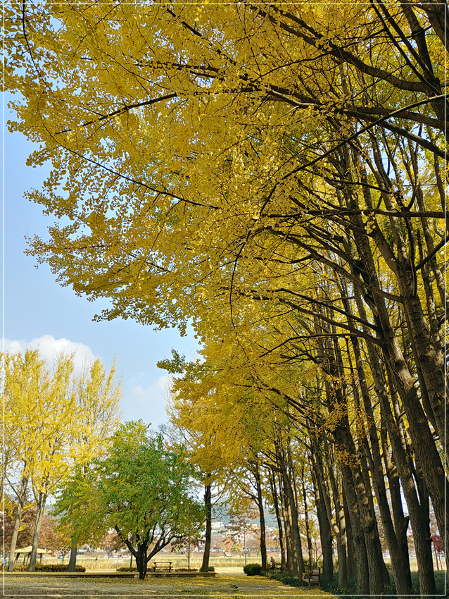 따뜻한 날씨 맑은 하늘 덕에 은행나무 단풍 색이 밝고 곱다.